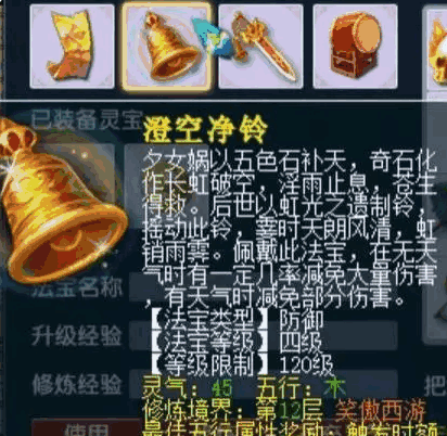 最后总结一下,澄空净铃完美代替所有甲类法宝。加速度无天气的129级比不上凌波仙符,任务凌波还是首选。同理,法术和物理伤害的4级应该是传统的落星飞鸿,笛子比新的2个4级法宝好点的,那2个需要触发对应天气才更好。2级剑可以代替试剑石,法系带试剑石十几法伤,可以换成2级剑了。