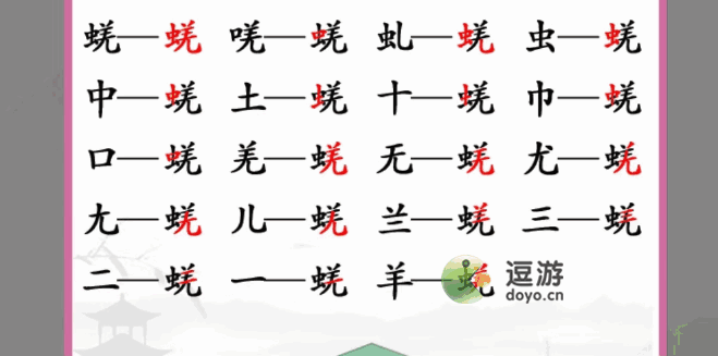 - 蜣找出17个字是:蜣、巾、无、一、儿、口、尢、兰、土、羌、三、虫、、尤、十、中、二、虬、羊