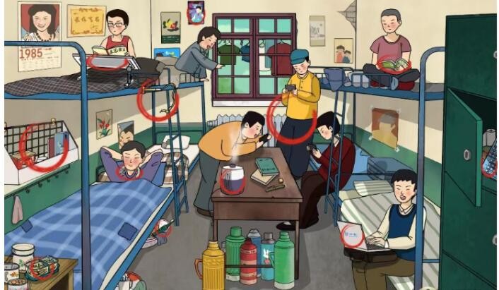 - 中间的桌子上有加湿器,旁边的人正在开黑,右边上铺的人在看交友技巧,下铺的人在用笔记本电脑;