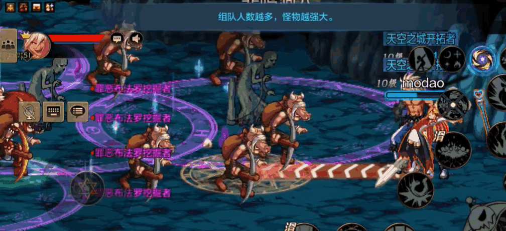 由罪恶布法罗队长带着一群队员,紫色阵内是无法攻击到怪物的并且队长没有死亡时,队员可以无限制的回血。