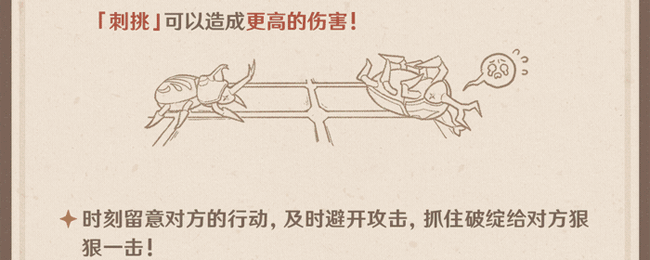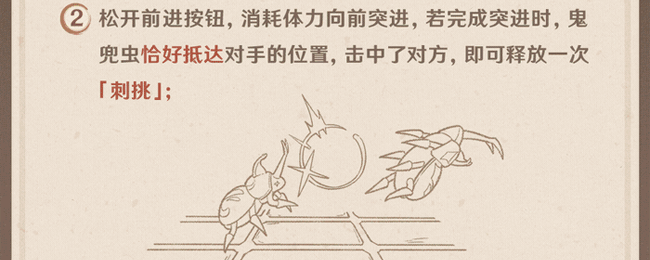 - 松开前进按钮,消耗体力向前突进,若完成突进时,鬼兜虫恰好抵达对手的位置,击中了对方,就能够释放一次刺挑。