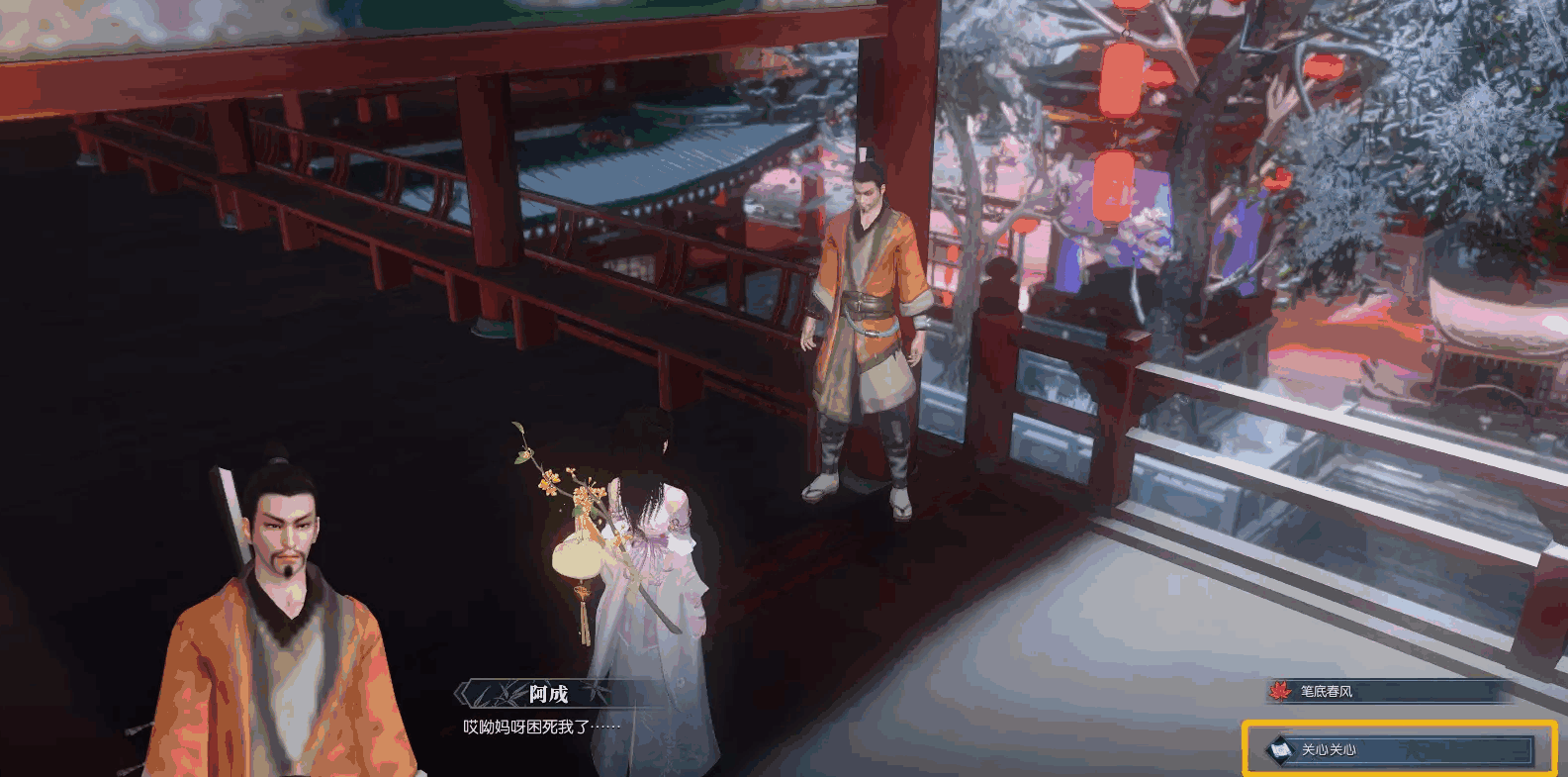 - 接着去甜水巷二层角落,和廊檐下458.677的阿成对话,选“关心关心”触发奇遇,下面就跟着做就行了(这是奇遇的第二个难点,比较难触发,没反应的话就只能一直对话)。
