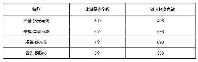 每只宠物想要出游的景点的个数不同,小贝在这里给大家整理了详细数量和一键消耗洛克钻价格,以供大家参考。