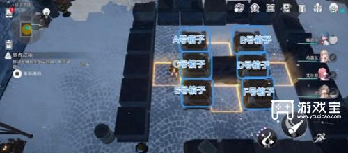 - 如图所示,将箱子标记为“A号箱子”、“D号箱子”、“C号箱子”、“B号箱子”、“E号箱子” A号箱子向左移动1格,然后向下移动1格,B号箱子向左移动1格,F号箱子向右移动1格,然后向上移动1格,E号箱子向右移动1格 ,解谜完成。