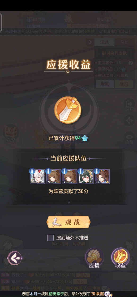 - 先介绍下常规的刷星操作,首先你要组个送死队把自己快速淘汰(脱装备下宝宝,死得越快越好),这样才能开启应援,也就是我们BUG的主角。应援前先观战,挑那些快打完的战斗进,最好是场面一边倒的局,选择应援然后等他们打完,星星到账后取消应援,再利用换应援的1分钟冷却再找新的场,尽量保证1分钟应援一场,这样就约等于1分钟4星星。