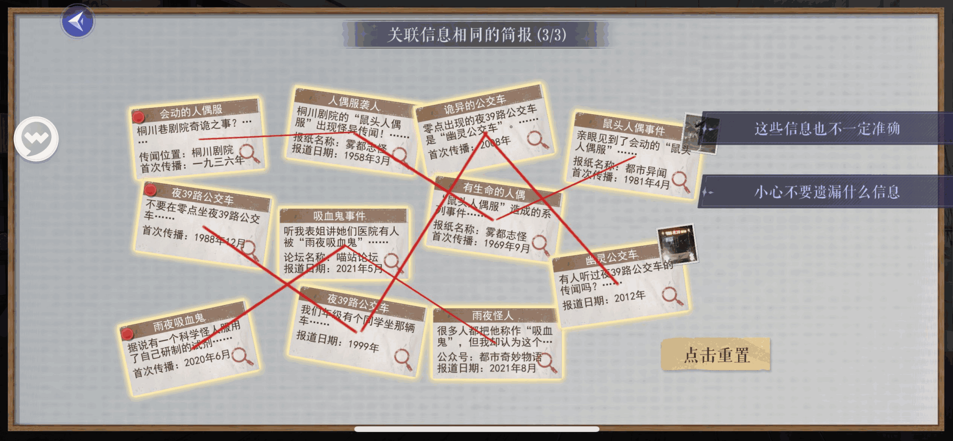 - 告示板上黄色放大镜,从左到右连线,选择<这些消息也不一定准确> —— 获得线索:吸血鬼传闻 + 传闻特点 + 理性分析