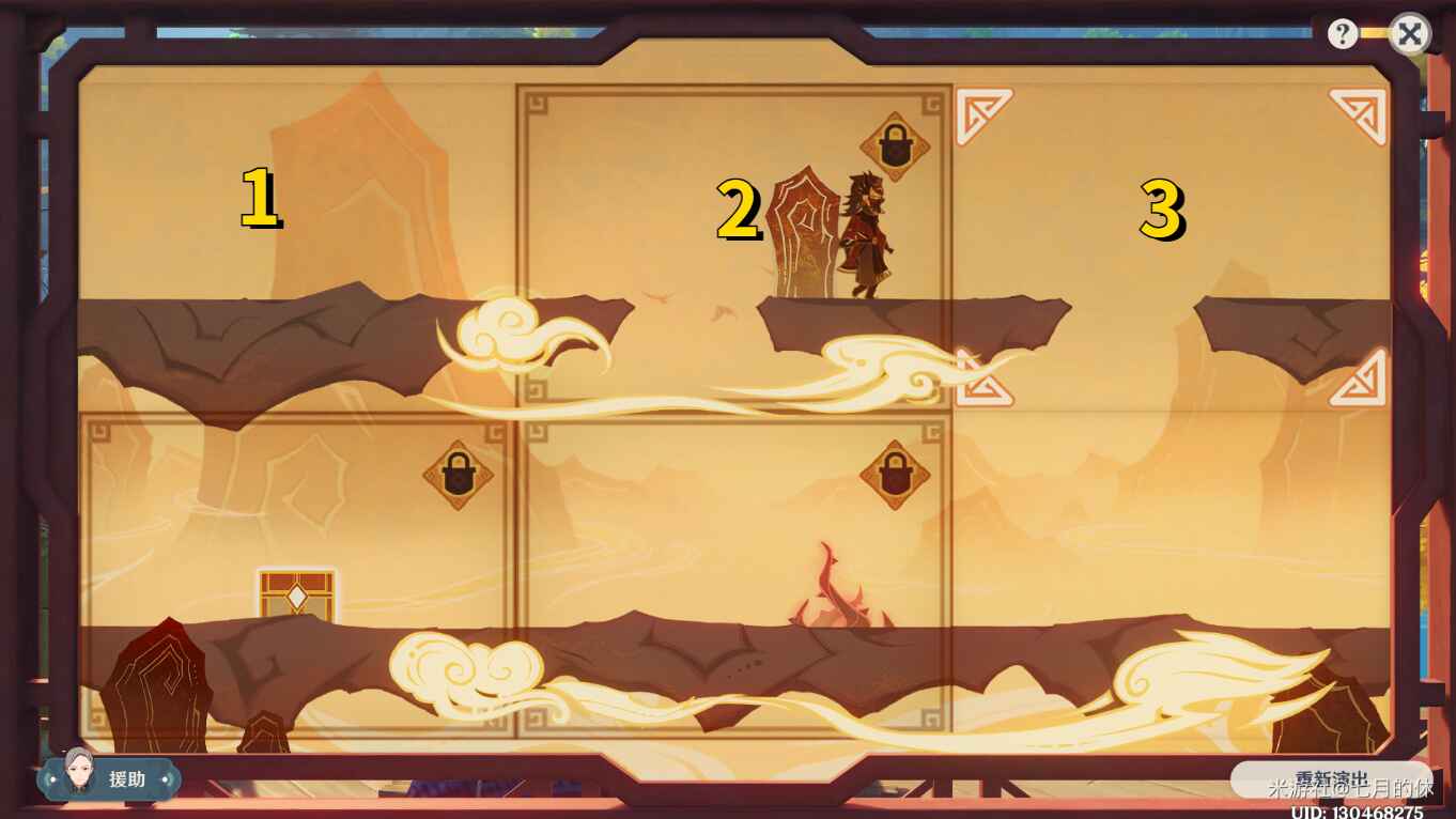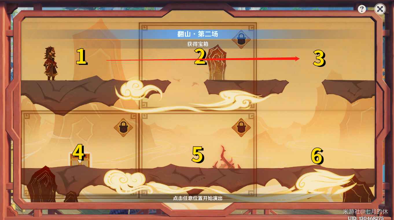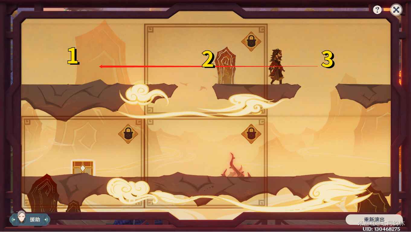 原神纸映成戏翻山第二场攻略- 开局把1号格子,拖到3号格子上拉,进行互换。