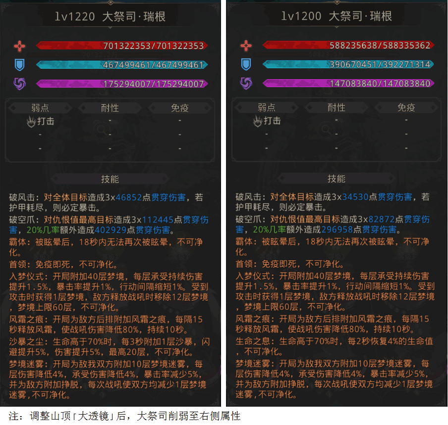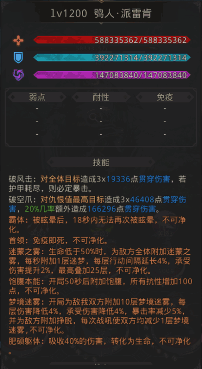 简述:主坦小丑帽+承受伤害(魔魂等),队伍有致盲即可(法师队可开局不战吼,故意叠20层美梦之境获取魔法伤害增益)