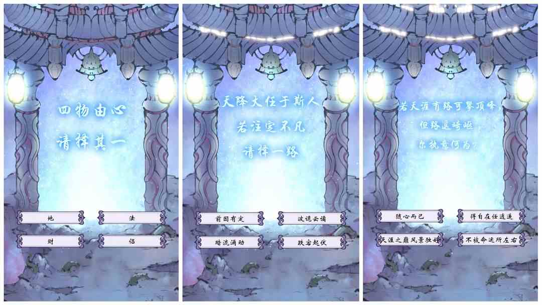 注册账号进入游戏,开头出现3个问题,本命身世的确定与这3个问题答案相关。规律比较简单,很容易掌握。本命身世就是走流程,本身没有什么作用。