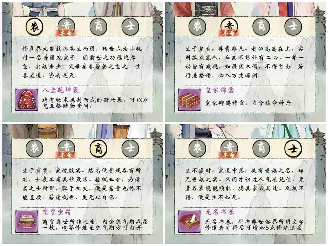 建议:自选身世选择皇室或士族最佳,任选其一,农民次之,商贾最次。自选身世开局所获物品数值较低,没有影响也不大,因此“选错了”也完全不要紧。