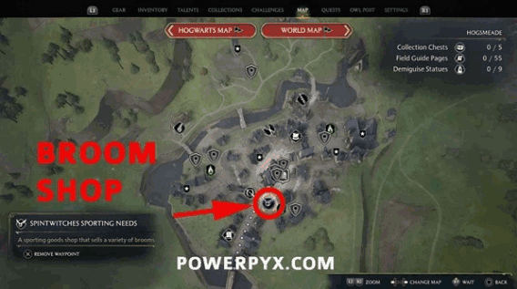 - 之后前往霍格莫德的扫帚店(位置如下图所示),花600购买飞行扫帚即可。