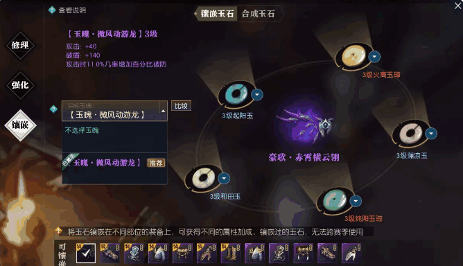 可以镶嵌玉石的部分是武器加全身防具,总计七件装备,没有复杂的选择,就直接点开目标玉魄,按照系统推荐的玉石套装镶嵌即可。