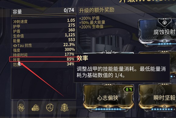 - 最后玩家也可以通过更改战甲的配卡,增加战甲的技能效率,并且技能效率越高,战甲每次施放的技能所消耗的能量便会减少,最高为百分之75。