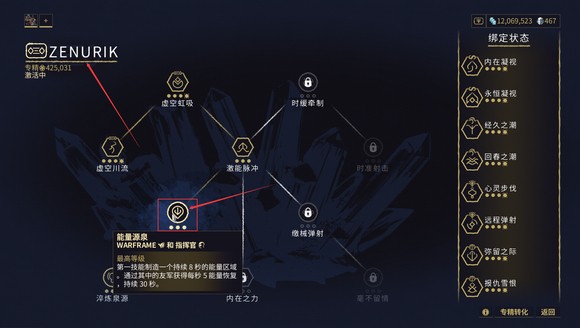 - 玩家也可以在指挥官的ZENURIK专精中点出能量源泉技能,点出该技能后,玩家使用指挥官的1技能可以创造一个能量区域,战甲位于该区域内可以持续恢复能量,并且在离开区域后依旧可以持续恢复几十秒能量。