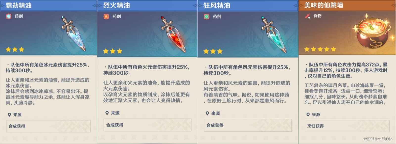 每种类型的料理,只能存在一个效果,以后吃的为准!根据自己主c元素选择精油。