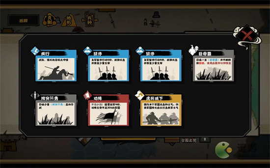 - 善行寒暄:全豹权势:用间获胜时,得回2点 政略 和2000兵甲