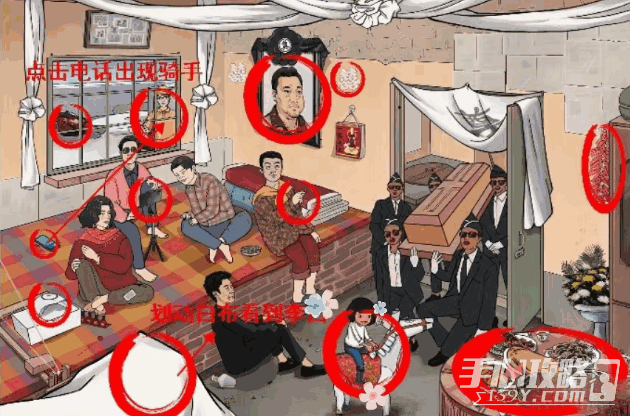 - 墙上有彩色照片和白色喜字,下面的人在嗑瓜子,掀开白布可以找到李白,小孩在骑纸马,桌子上是喜宴,柜子上挂着鞭炮