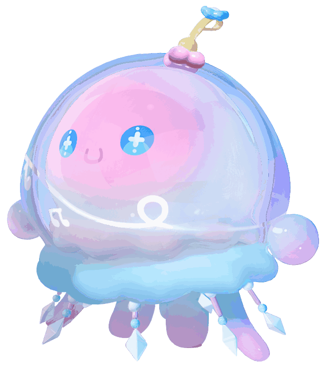 天真乐观,神经大条的“水母尤莱亚”圆润可爱,紫色半透明的伞状体上点缀律动的音符,映出她微笑的面容,闪亮的蓝色星星眼萌力满分,头顶的风铃挂绳还点缀着繁花;柔软的触手用闪亮的珠串装饰,散发的光芒随着身体摆动,为清新可爱的她增添华丽色彩。