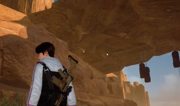- 玩家到达这个地方的时候需要往左边从上面走,看到有陡坡的地方往上移动,然后再往前面走,可以看见平地,再看见远处宝箱就在平地的边上,玩家朝着箱子方向移动吗,到达箱子旁边。