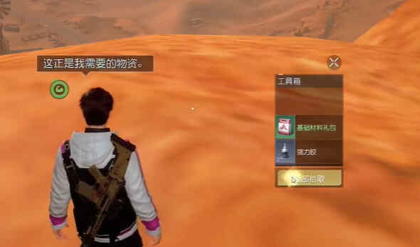 - 到达箱子旁白后点击开启工具箱,然后就可以获得里面的物品,基础材料礼包x1、强力胶x2、小袋银币x2、沙漠探索积分x1,那么赛道巨岩这边的宝箱就已经找完。