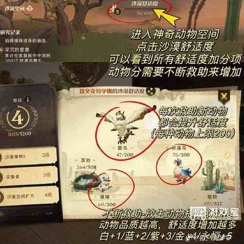 - 提升神奇动物空间的舒适度可以提升沙漠适性词条的品质,5级舒适度就可以出金色沙漠适性,战斗中进一步提升输出。