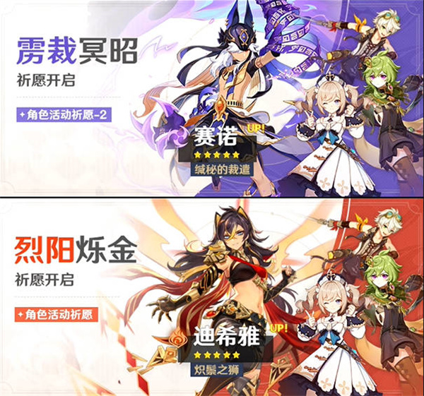 - 航裉旄?铝?.5的上半卡池,分别是迪希雅,还有赛诺,四星的角色为班尼特和芭芭拉,还有柯莱;