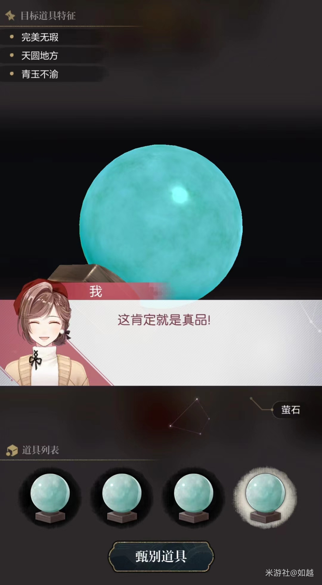 藏品:夜明珠(灼灼萤石,青玉不渝,完美无瑕,天圆地方),选第4个,对应梅斋-曹三娘剧情。