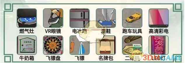 - 八零回忆一 不和谐是:燃气灶、电冰箱、跑车玩具、高清彩电、二维码、飞镖盘、潮鞋、VR眼镜、牛奶箱、飞镖、名牌包、LED灯