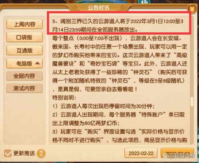 由于三界模式的全面放出以及各大服务器金价持续增高的缘故,策划已经很久没有为玩家们安排云游道人这一个NPC了,云游道人的出现不只是给区内玩家带来大量的高级魔兽要诀或者星辉石以及钟灵石,云游道人的出现更是对于全服特殊仓库有80个E的限制要求,从而进一步提升区内梦幻币的价格!