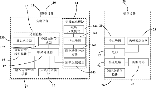 同样是充电平台和用电设备之间,需要两个设备内的谐振器共同工作产生一个磁场共振,实现能量转化无需设备之间的接触;
