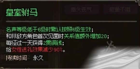 - 成亲之后得到50000钱,康王关系+20,康王府关系+18,郡主关系提升80点,名声+500,并获得永久buff皇室驸马。