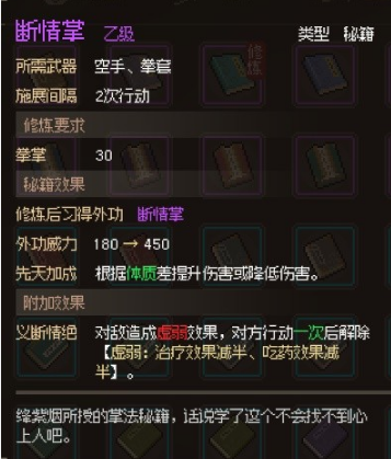 大侠立志传断情掌怎么获取,个中断情掌是一个紫色武学,对于着仇敌们运用之后不妨让仇敌进来病弱状况,有玩妓?谢领会该武学何如获得,具体的内容如下所述!