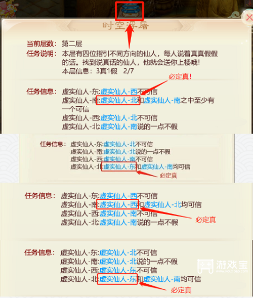 - 第一层任意方位均可,每层提示,两个那句话两个人中的第一个人一定为正确的npc。