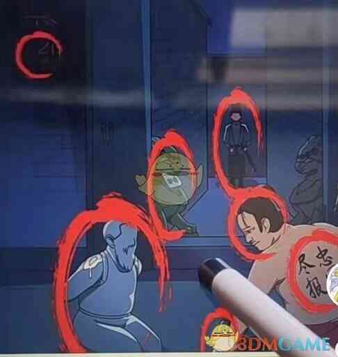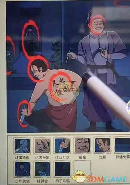- 点击光膀子的背上的字,毛笔字不对,点击刀,点击头是沈腾
