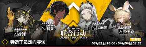 活动说明:活动期间[联合行动]特选干员定向寻访开启,该寻访卡池列表中六星干员与五星干员仅出现以下干员