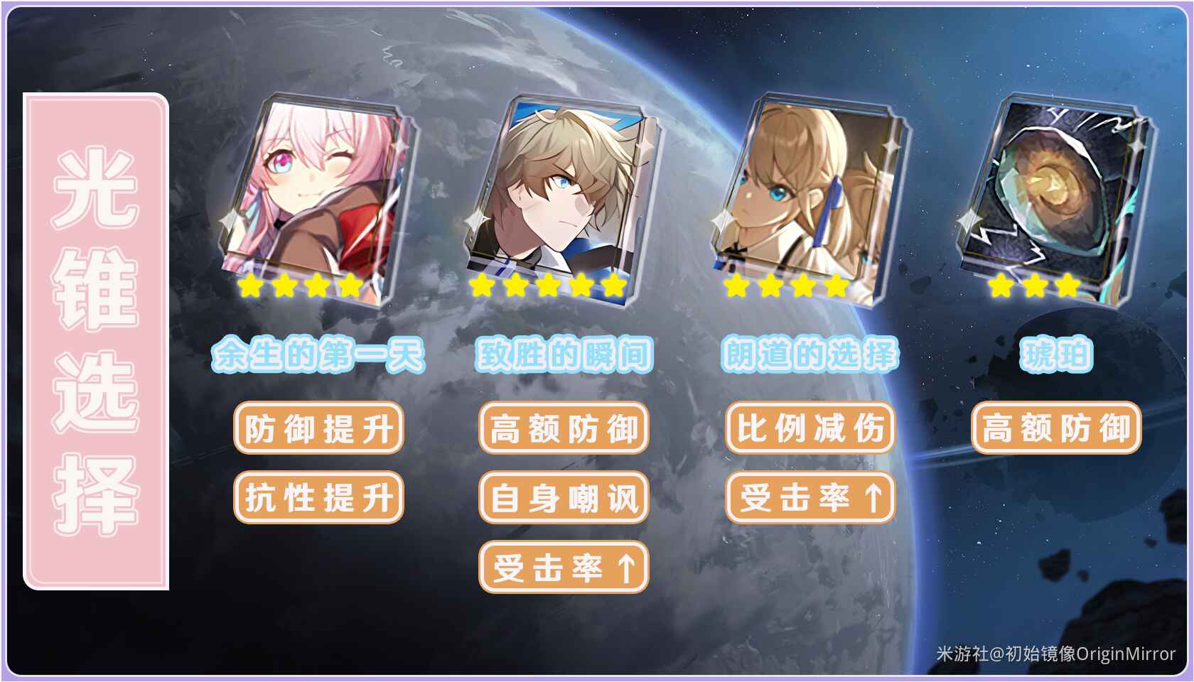 光锥 朗道的选择 可以提升装备者的受击率,并为装备者提供一定比例的减伤效果,可以让三月帮队友承担更多伤害。