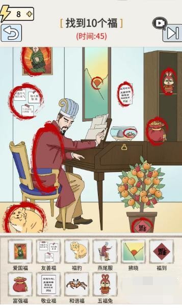 - 玩家可以看到这边的10个福,就是需要找到一切关于福的物体,看到了像福的物体也是可以点击的