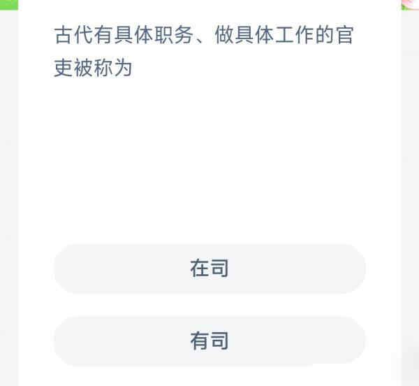2023支付宝蚂蚁新村3月15的题目已经更新了,今天的题目为:古代有具体职务做具体工作的官吏被称为?正确答案是什么?有司还是在司呢?很多小伙伴可能还不太清楚。下面小编就为大家带来了正确答案分享,希望能帮助到你。