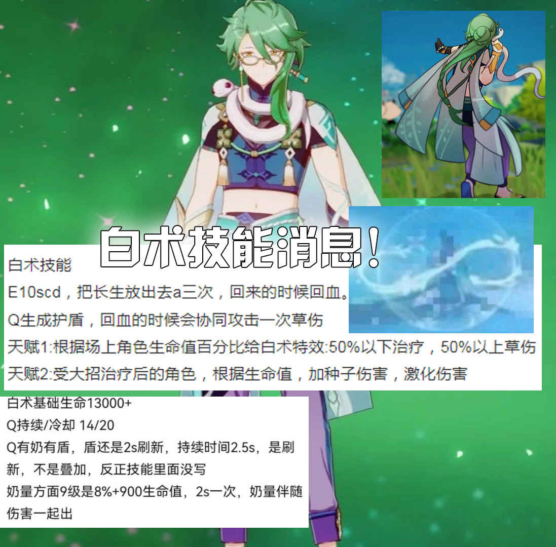 各位大佬好呀,就在刚刚,3.6测试服的内容被泄露,就多位舅舅曝光了有关3.6白术的更多消息,其中就有著名的“计划通”舅舅,所以消息等于是实锤了,首先来看白术,E技能共10秒cd,丢出长生,a敌人3下,回来时可为自己奶一口血量。Q技能共20秒cd,持续时间12-18秒,召唤长生来为自己生成一个护盾,盾量较薄,奶量却不小,q技能持续期间,在前台被奶时就会有协同攻击,附着规律为2.5s3次。