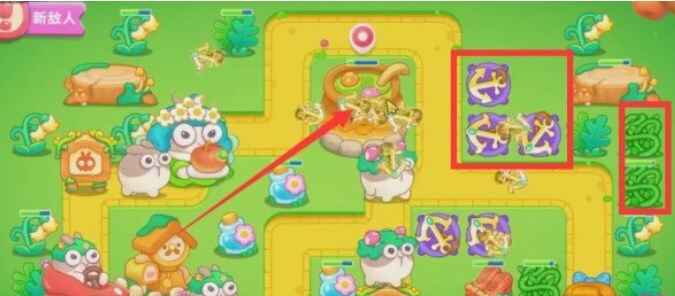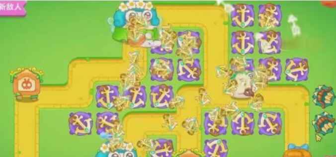 - 开局在下图位置放置两个船锚,锁定左边的小草,随即将附近周围的道具进行拆除,有钱将炮塔进行升级;