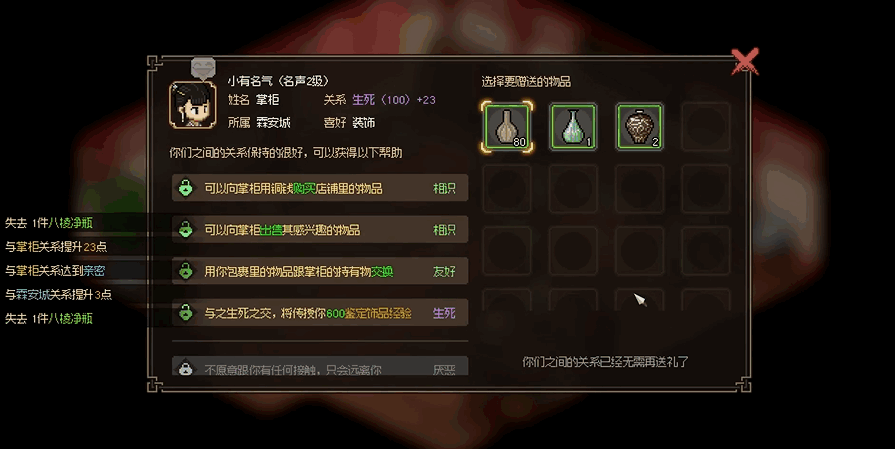 大侠立志传凝香馆掌柜喜欢什么,而按照每个NPC的宠爱咱们不妨给他们举行送礼进而擢升美感度来解锁更多的掘法实质,凝香馆掌柜这个脚色的宠爱大概许多小友人煌?了了,更多有关游戏的相关内容请关注。