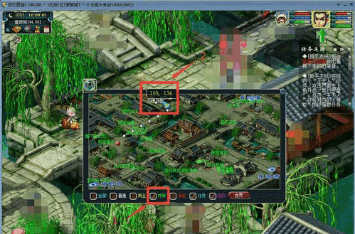- 到 建邺 后,如图所示,使用快捷键 Tab键 打开小地图,勾选地图下面的 特殊 项目,就看到地图上出现了很多绿色的NPC名字,选择 勾魂马面 ,游戏角色会自动寻路走过去;