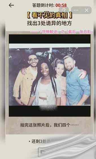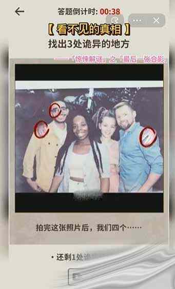 - 本关卡提示是:提示是:找出三处诡异的地方,拍完这张照片后,我们四个...