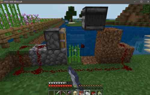 等到甘蔗成熟后,侦测器就会发出红石信号启动活塞收割甘蔗。