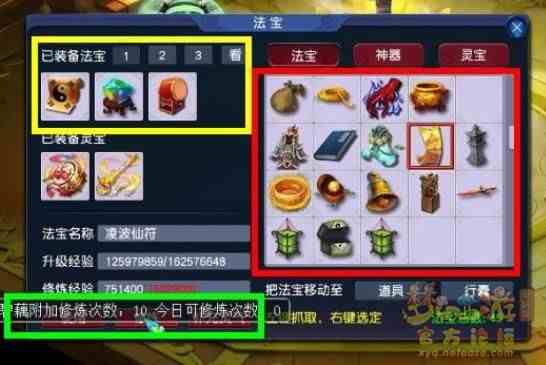 其他区域:位于法宝栏的右上角,可切换法宝储存区域、神器储存区域、灵宝储存区域。