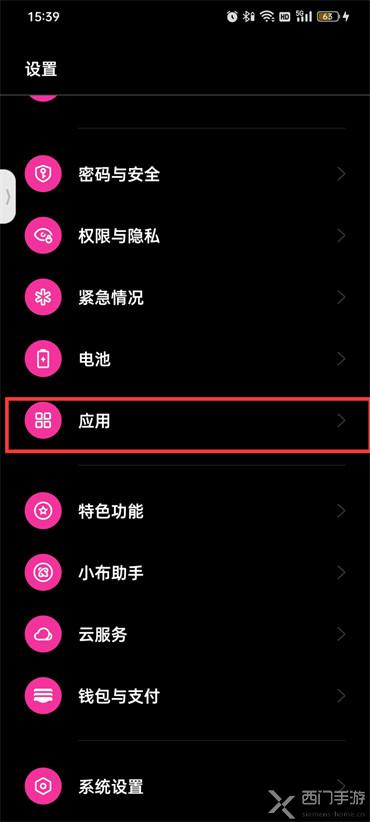 - 首先打开手机上的设置软件,进入到设置的页面中找到 应用 点击;