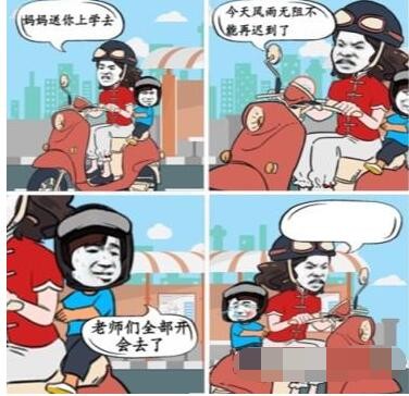 - 这一关的提示是想办法让妈妈回去。图一妈妈送孩子上学,图二妈妈说今天风雨无阻不能再迟到了,图三孩子说了一句话,图四妈妈就回去了,所以需要选择一句迟到不影响的话,也就是 老师们全部开会去了 ,都开会就没有人管迟到了