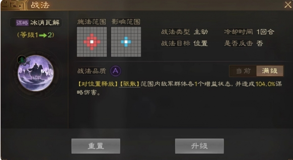 驱散 范围内敌军群体各1个增益状态,并造成51%~102%谋略伤害。