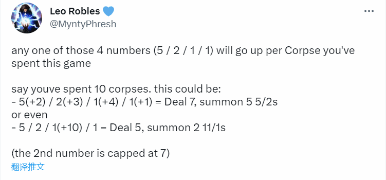 你每消耗一具尸体,描述中的4个数值(5/2/1/1,造成的伤害,灵魂的数量,灵魂的攻击力,灵魂的生命值)之一就会增加。(第二个数字至多为7,召唤的灵魂数量)