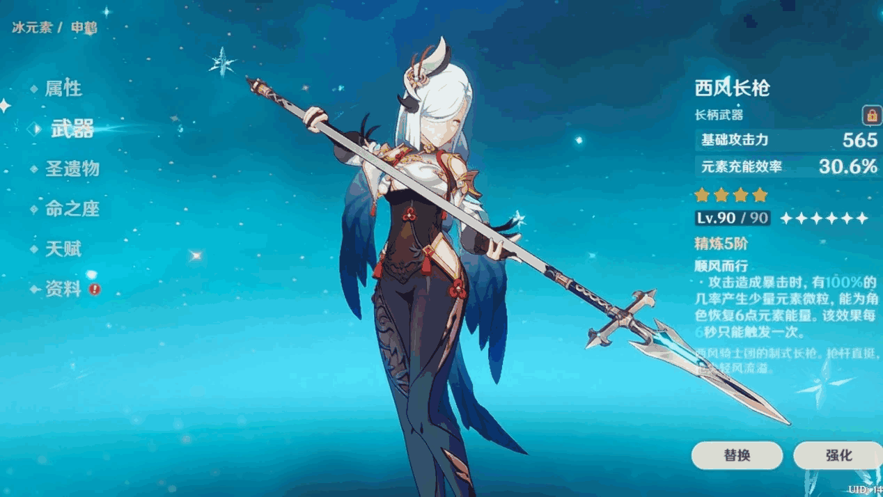 圣遗物属性的选择,最简单也通用的就是主属性全选攻击力%数为主的时之砂、空之杯和礼之冠,而若是想打一点伤害也可以考虑换成冰伤杯,主属性不用选元素充能的原因是申鹤的大招能量虽然要80点,但是可以透过队友和自身产生的元素微粒来回复,因此让辅助或伤害效果提升才是最重要的,其次副属性的部分可以选择攻击力%数>元素充能效率>双暴。毕业面板就是让攻击力越高越好,基本3000以上,也有大佬可以堆到5000的,再来考虑元素充能效率尽量能够越接近200% 。